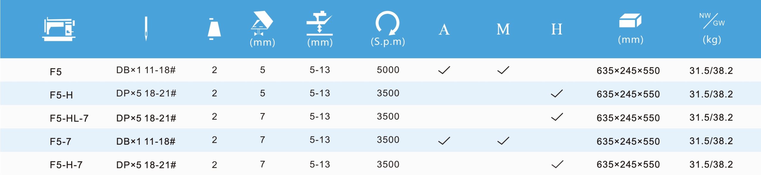 Heavy-duty configuration: needle system DP×5 (18–21#) for heavy fabrics.