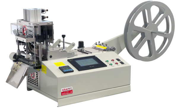 Designed for hot cutting of carrier tapes, webbing, Velcro, rubber, zipper tapes, and much more. The machine automatically measures and cuts pre-programmed lengths of tape, simultaneously sealing the edges. This is crucial when cutting materials prone to fraying (sealing the edges applies to synthetic materials, which are susceptible to melting at high temperatures).