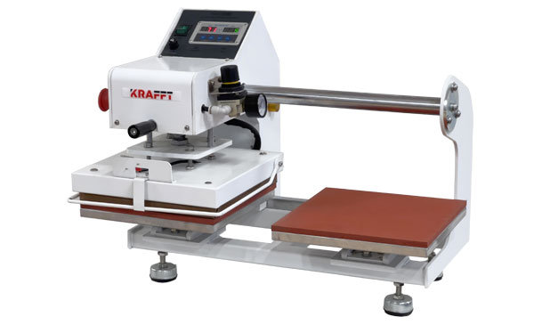 Easy to use, two-platen transfer press with pneumatic pressure. The machine has two work tables and an adjustable head with an upper heating pressure plate. The device is equipped with a clear display for adjusting the heating temperature and the pressing time, after which the head raises automatically. Adjustable pressure force using the knob on the pressure gauge. The pressing head is moved manually.