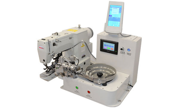 Two-thread electronic button sewing machine with automatic button feed. Designed for sewing flat buttons. The lockstitch stitch ensures a more durable attachment, eliminating the risk of accidental unraveling.