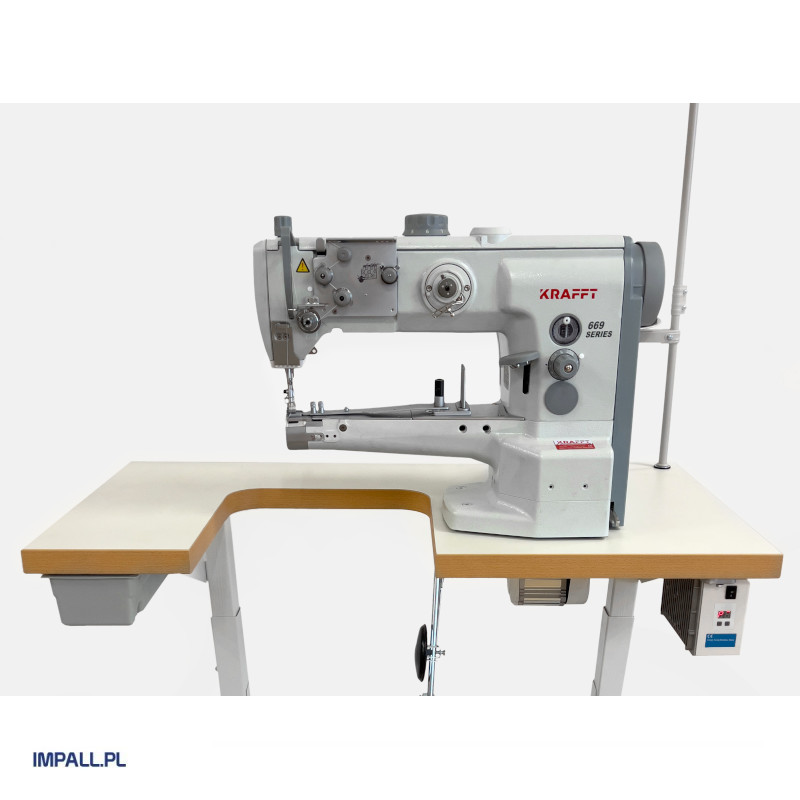 1-head cylinder bed sewing machine, designed for heavy-duty sewing. The machine is equipped with triple feed (drop feed, needle feed, walking foot) and an enlarged capacity hook. The machine is fitted with an energy-saving servo motor. Optionally, there is the possibility to install a needle positioning function.