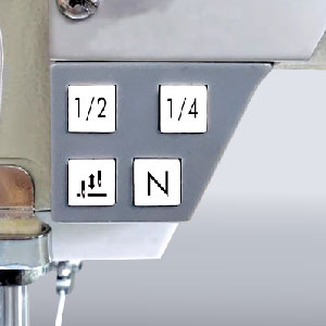 Stitch density buttons for 1/2 and 1/4 stitch control located on the panel for quick fine-tuning.