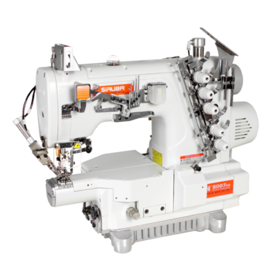 The Siruba S007KD-W122-356/PCH-3M is a specialized ladder stitch sewing machine with a small cylinder bed, ideal for sewing small clothing elements such as sleeves, legs, and children’s or sportswear. It features a 3-needle configuration with upper interlacing, and can also sew using a 2-needle ladder stitch without upper interlacing. The narrow cylinder circumference of 181 mm and precise needle placement make it perfect for detailed sewing tasks.